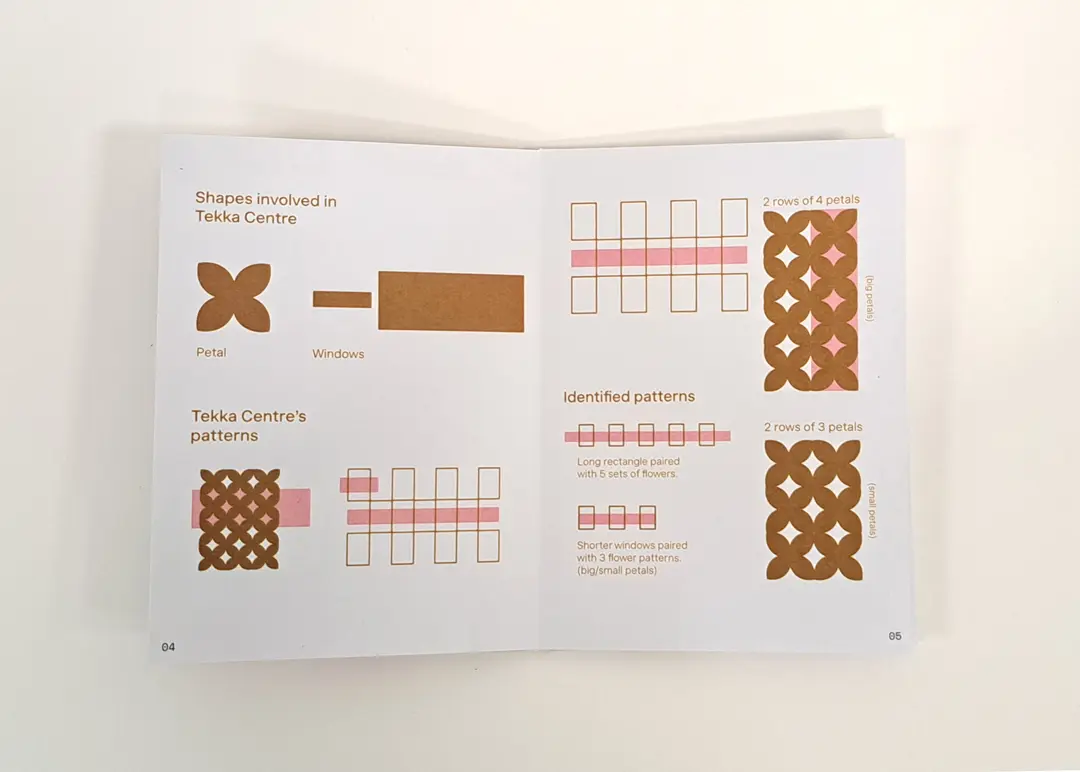 We were tasked to create graphics based on a building that we had chosen. Our team chose Tekka shopping centre, it is made up of organic shapes that look like petals, all framed in a rectangle, scattered across the building.