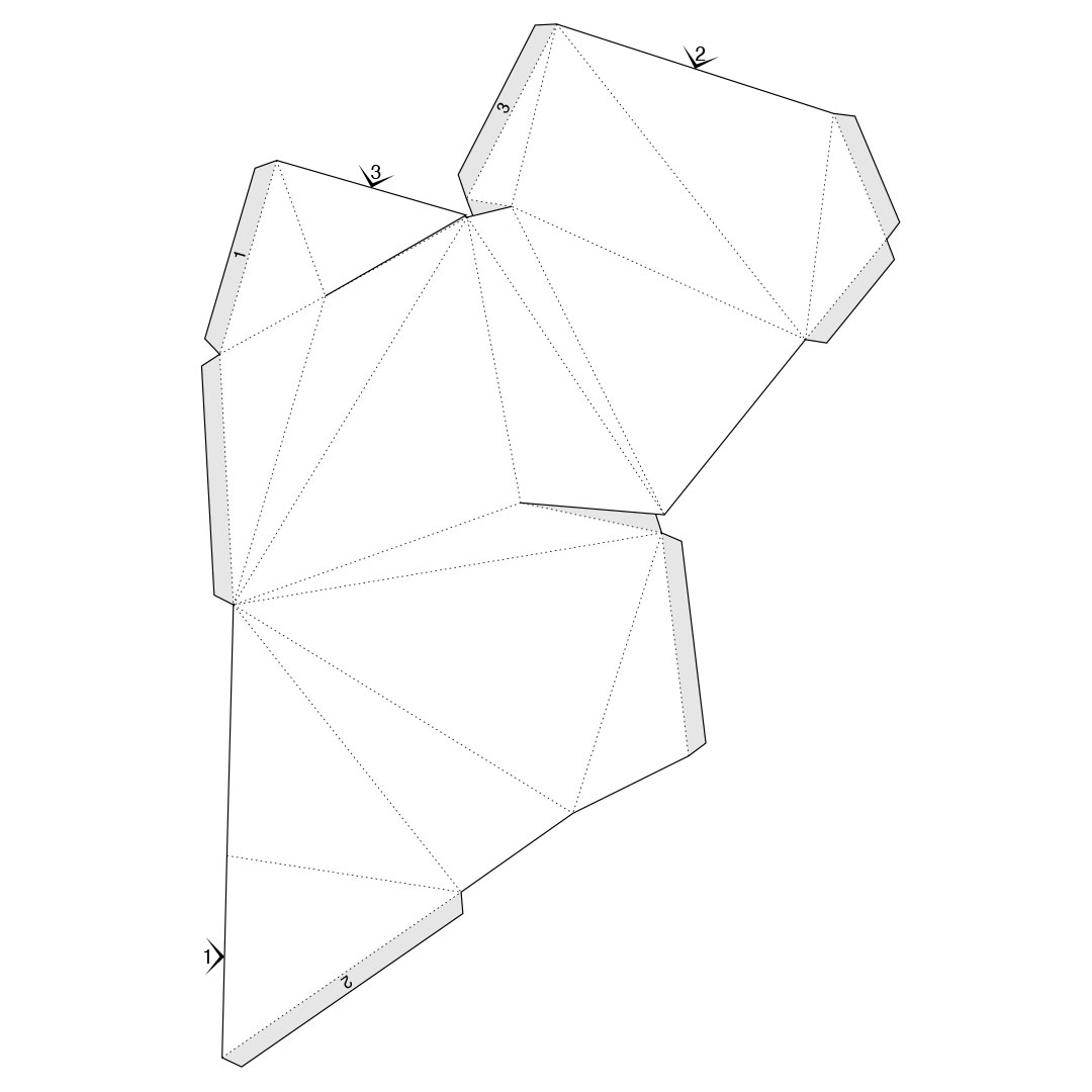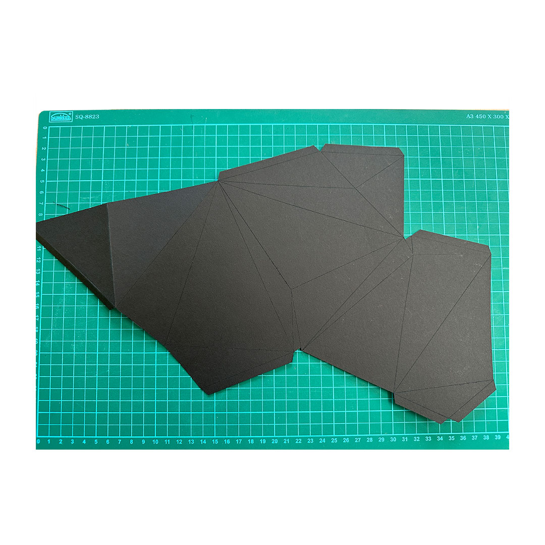 After finalising my design in p5.js, I exported the file into Blender and used the Paper Engineer plugin to unfold the polygon. I found the plugin incredibly useful—it transformed a complex, irregular shape into a workable template, opening up new possibilities for installations I once thought were too difficult to create physically. I converted the unfolded SVG to PDF, printed it, and overlaid it onto 230gsm paper. While the thicker paper added stability, it also made scoring more difficult, sometimes damaging the surface. In hindsight, a slightly thinner stock might have been a better balance between structure and flexibility.