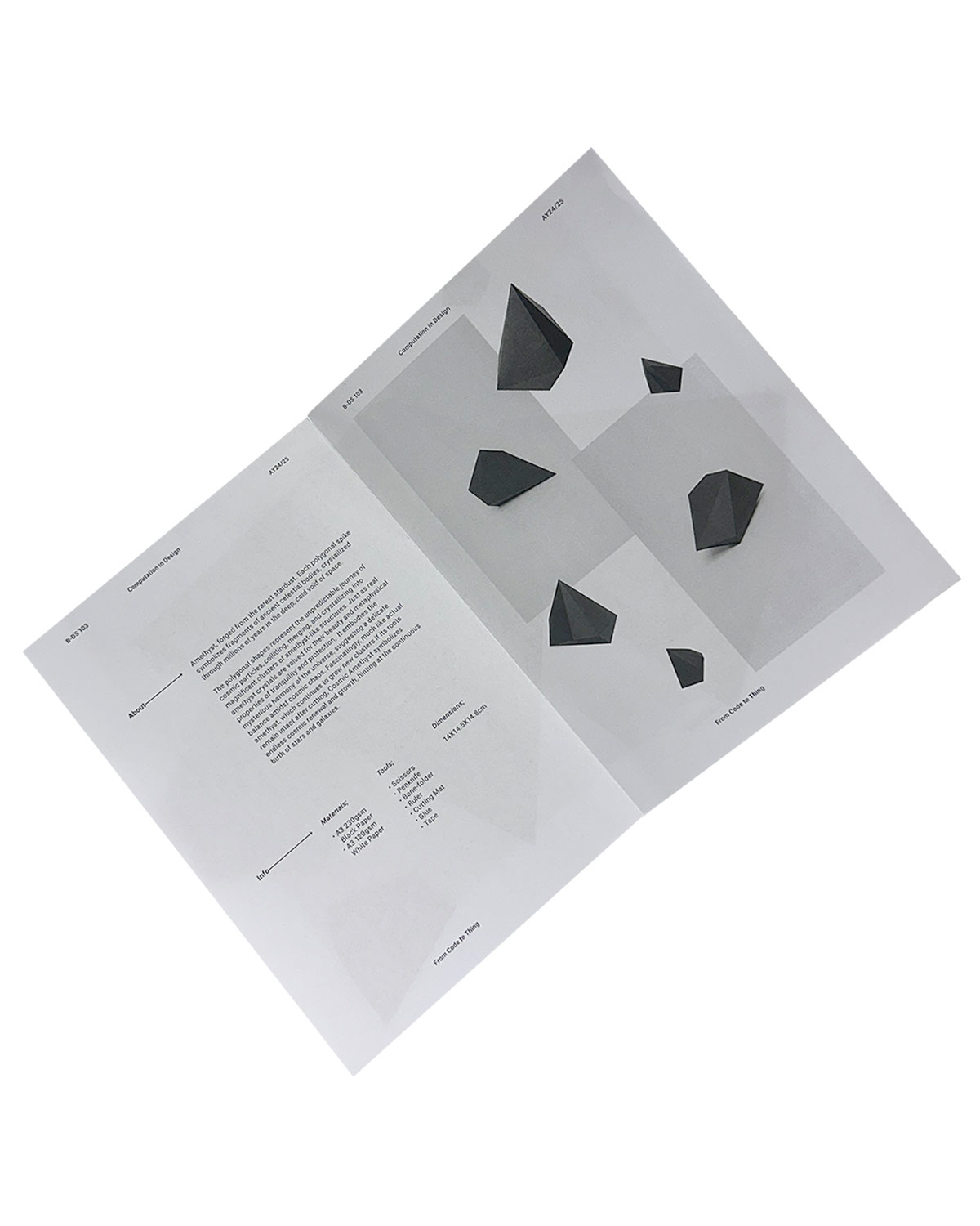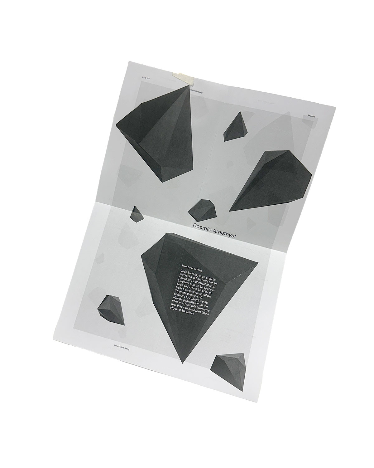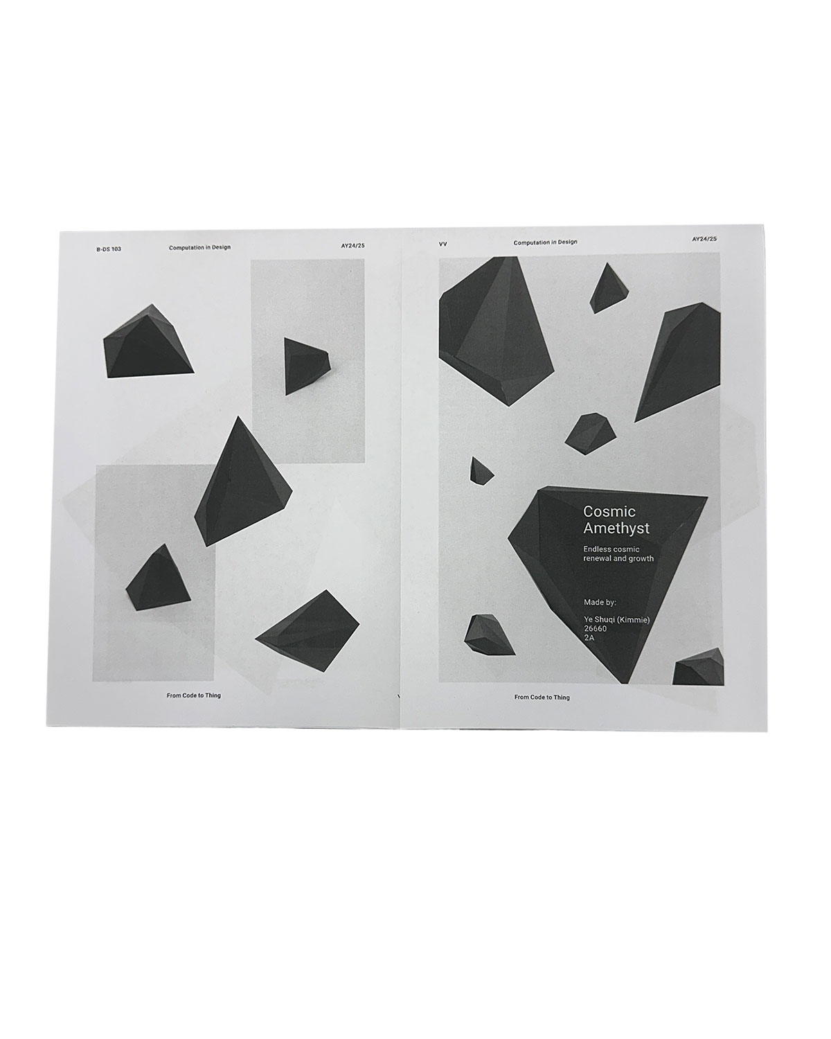 This project taught me that code is creative—it’s not just about control, but about expression. Variables and coordinates became tools for imagination, and small changes led to completely different outcomes, almost like drawing with logic. I also learned that failure is part of the process. When things didn’t work in p5.js or Blender, I had to adapt, and those moments often led to more interesting results than I initially planned. The form and meaning of my work became deeply connected—the irregular, crystal-inspired shape wasn’t just visually complex; it carried the narrative of cosmic dust and endless growth, evolving with each design decision. Crafting required patience and precision. Through paper engineering, I learned how small errors could affect the entire structure, and that true understanding only comes through making. I also realised that presentation matters—how you layout, position, and frame a piece can reinforce its story and shape how others experience it. Above all, I came to see that perspective shifts everything—whether through code, craft, or camera, each viewpoint offered something new, reminding me that design is always multi-dimensional.